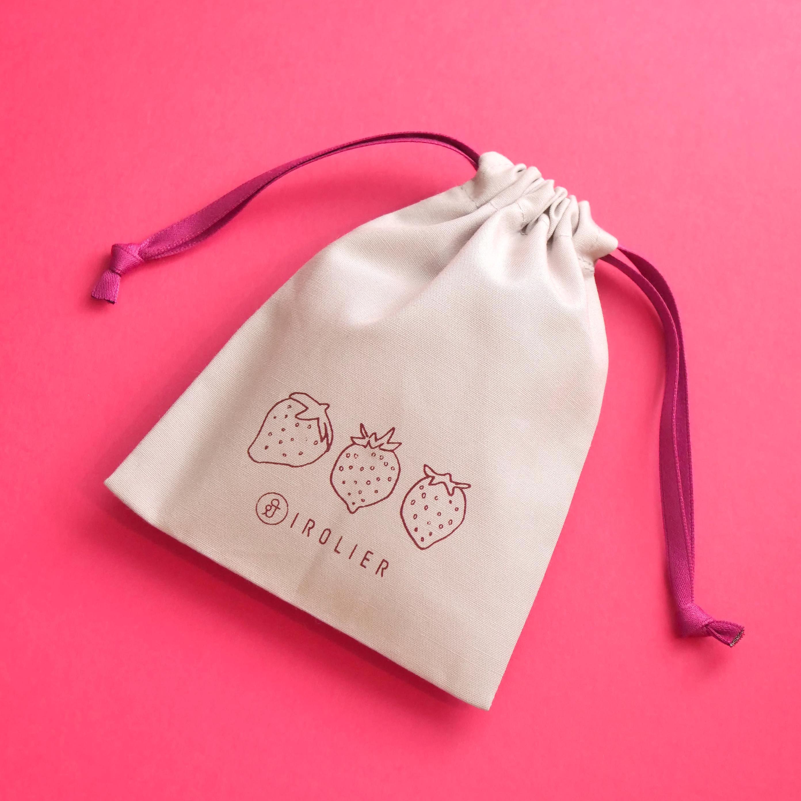 4月はイチゴの巾着にてお届けいたします。デザイナーの娘が描いたイラストを使用しています。